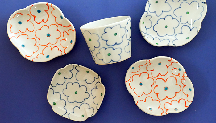 繊細なもの、大胆なもの、花をモチーフにしたいろいろな絵柄が人気の高原真由美さん 新作の6.5寸皿も