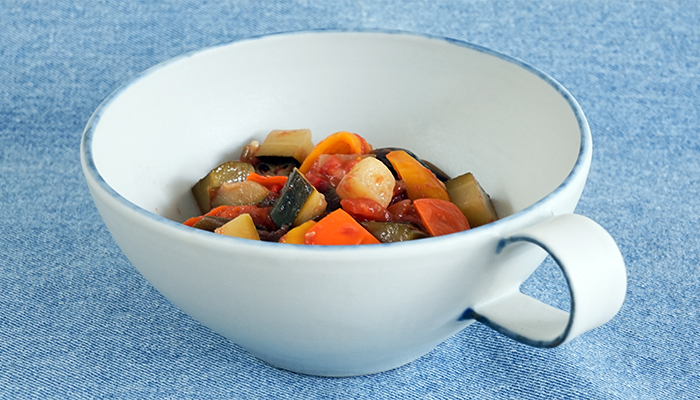 2026.05.01 さりげない彩り きれいに出来上がった形をいかすため、さりげなくフォルムを強調するブルーのラインを、渕と持ち手に 配したスープカップ スープだけでなくいろいろ使えそうなので、本日はラタトゥイユをいれてみました スタッキングもできる、使い勝手のいいうつわです