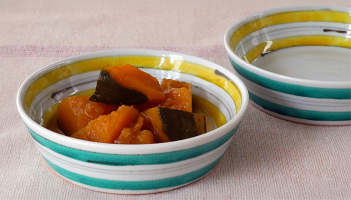 というわけでかぼちゃの煮物 内外に施された色違いのコマ模様が、パッと目を引く平小鉢に盛り