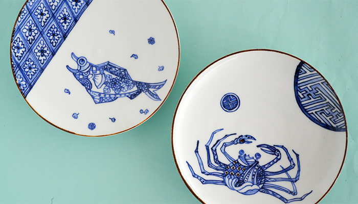 縁起の良い吉祥模様として、うつわの絵柄に使われてきた魚やカニを花柄や幾何柄を取り入れて
