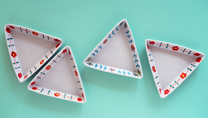 ちょっと変わった三角形のうつわは、オードブルやおやつを容れるのに、ほどよい一辺14cmほどの