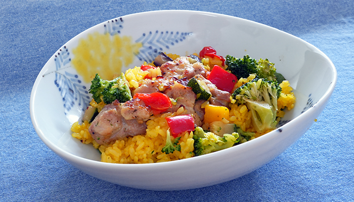 買ってきたチキンパエリヤ お料理を包み込むような盛り付けができるうつわです