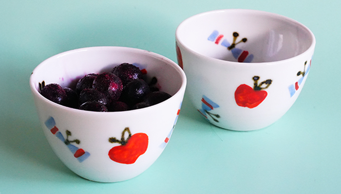 真由美さんの4.5寸鉢に盛りつけてみました 線で絵を描いた上に黄色をのせる線彫りという手法で、