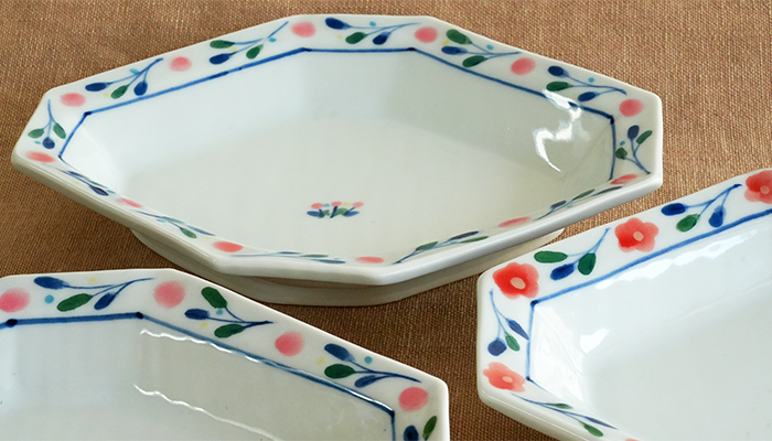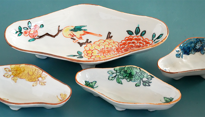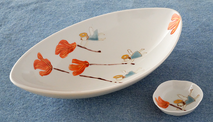 艶やかなお花が描かれた山本恭代さんが創る木瓜型の皿 足がつけられているので特別感が漂います