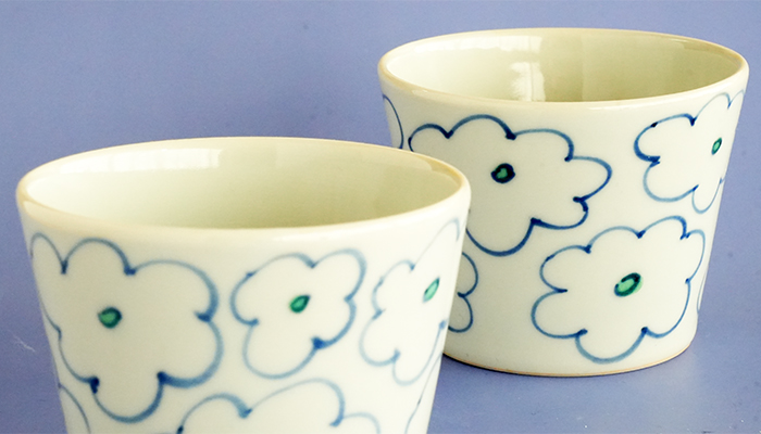 空にポカンと浮かぶ雲をモチーフに、カワイイお花を絵柄にした蕎麦猪口 のんびりとした雰囲気が