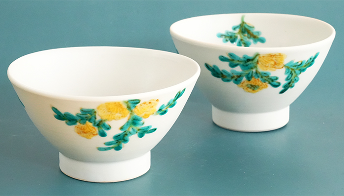 堀畑蘭さんのロングセラー「色絵黄花」シリーズの飯碗 少しぷっくりと艶やかに仕上げられた