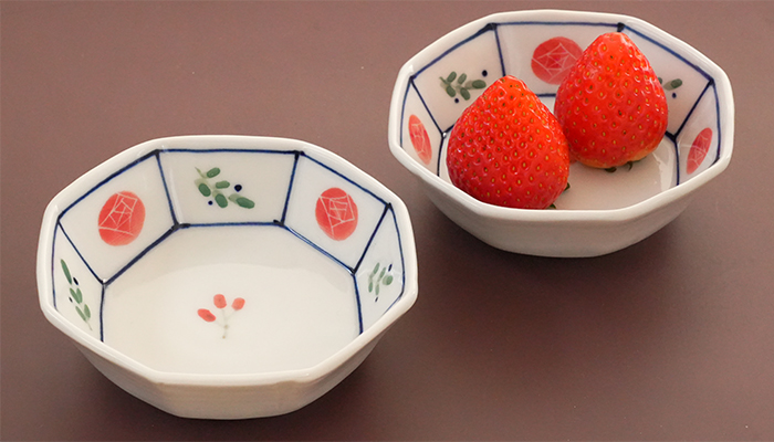 朱赤やピンク系の色使いがカワイイ表情をかもしだす米満麻子さんが創るうつわ こちらの八角小皿は、