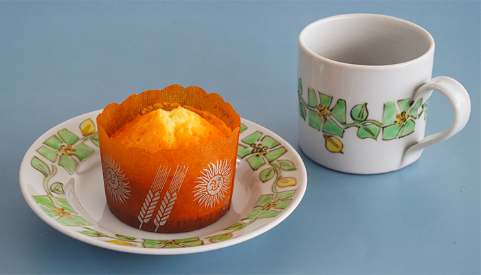 黄色い花と緑の葉っぱは、柔らかな印象をかもしだすマットな素地との対比が印象的 少しアイボリー