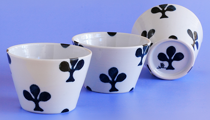 クローバーをモチーフに図案化した絵柄の蕎麦猪口は徳永遊心さんの作 口が広く浅めなので、小鉢や