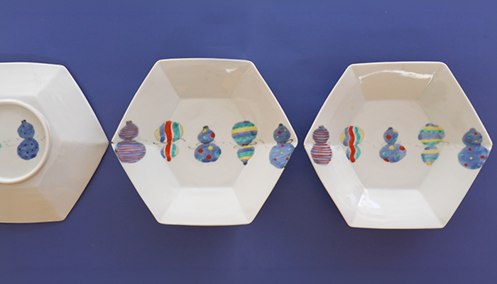 横井佳乃さん作「六角深皿」 九谷青窯時代から、さまざまな絵柄で創られてきた万能皿です