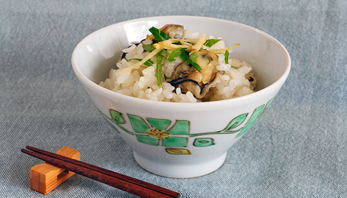 三つ葉と生姜を添えて盛りつけたのは、女性の手にも収まりやすい少し小ぶりの「色絵花めぐり 飯碗」