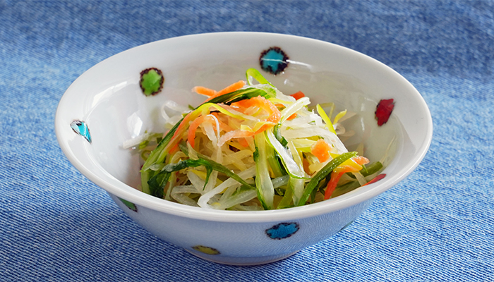たくさん見かけた狛犬の紋様がモチーフなのだとか 本日は大根とニンジンと水菜を千切りにした