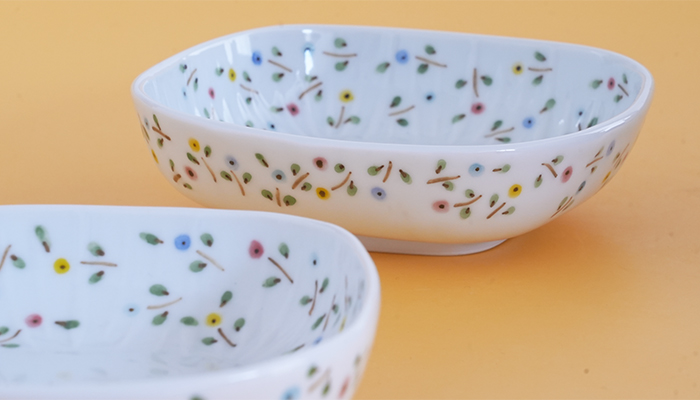 高橋順子さんから届いた新作「小花 四角小鉢」淡いトーンのカワイイ小花を内外に散らした絵柄は、