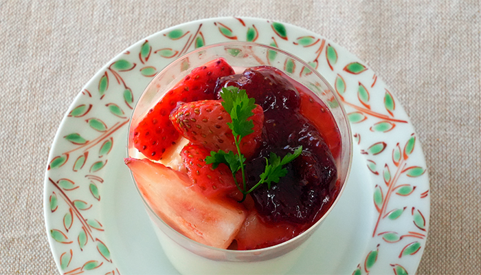 小さなリムプレートに杏仁プリンをベースにしたイチゴケーキをのせてみました