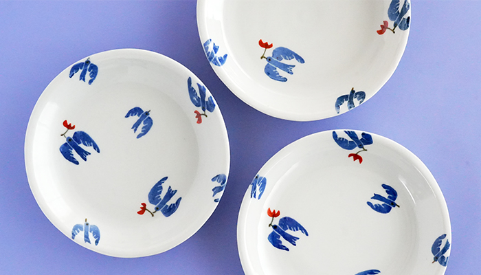 青い鳥が軽やかに飛び交う17cm皿 青と白のコントラストに赤いお花がアクセント シンプルで